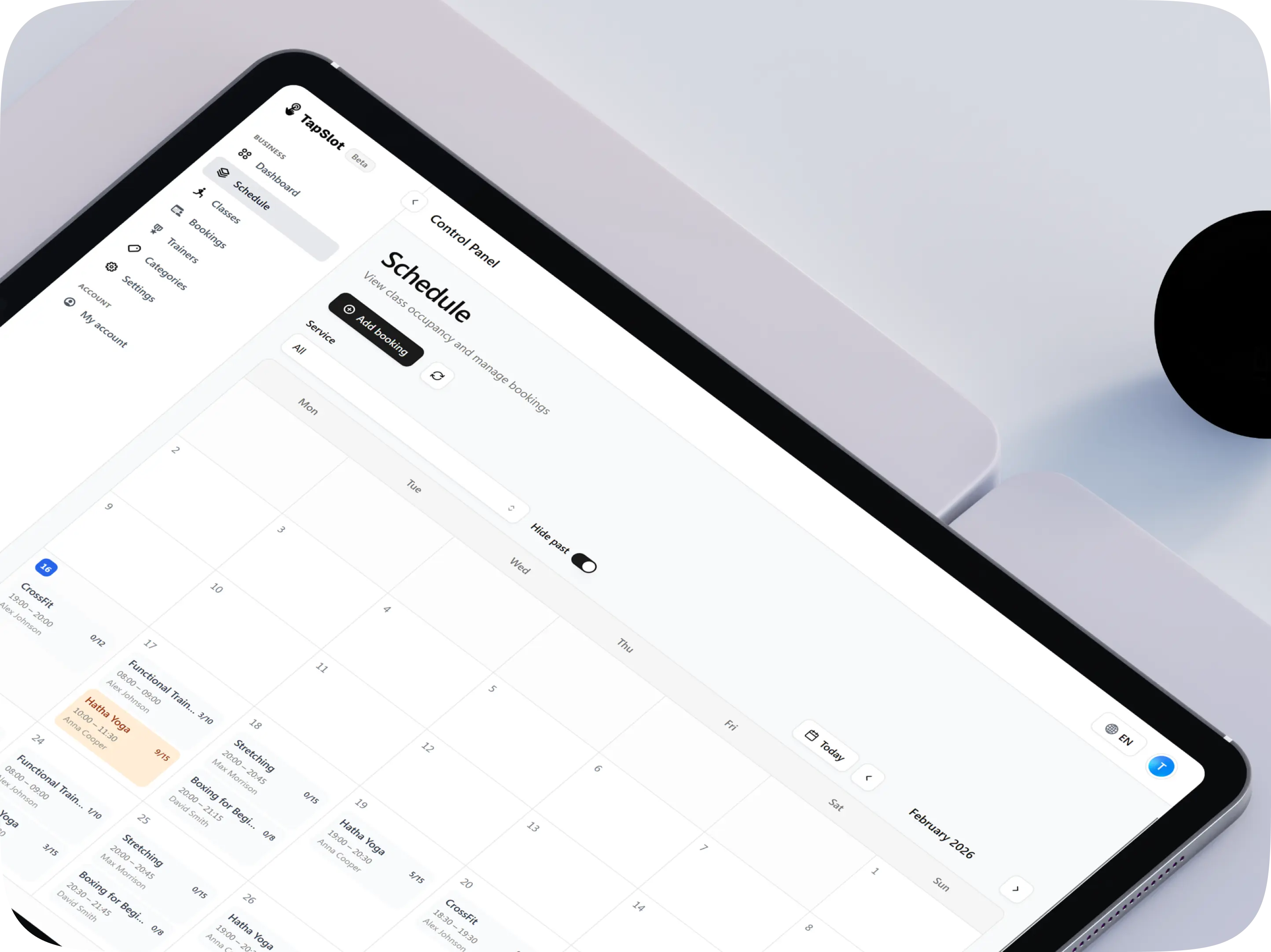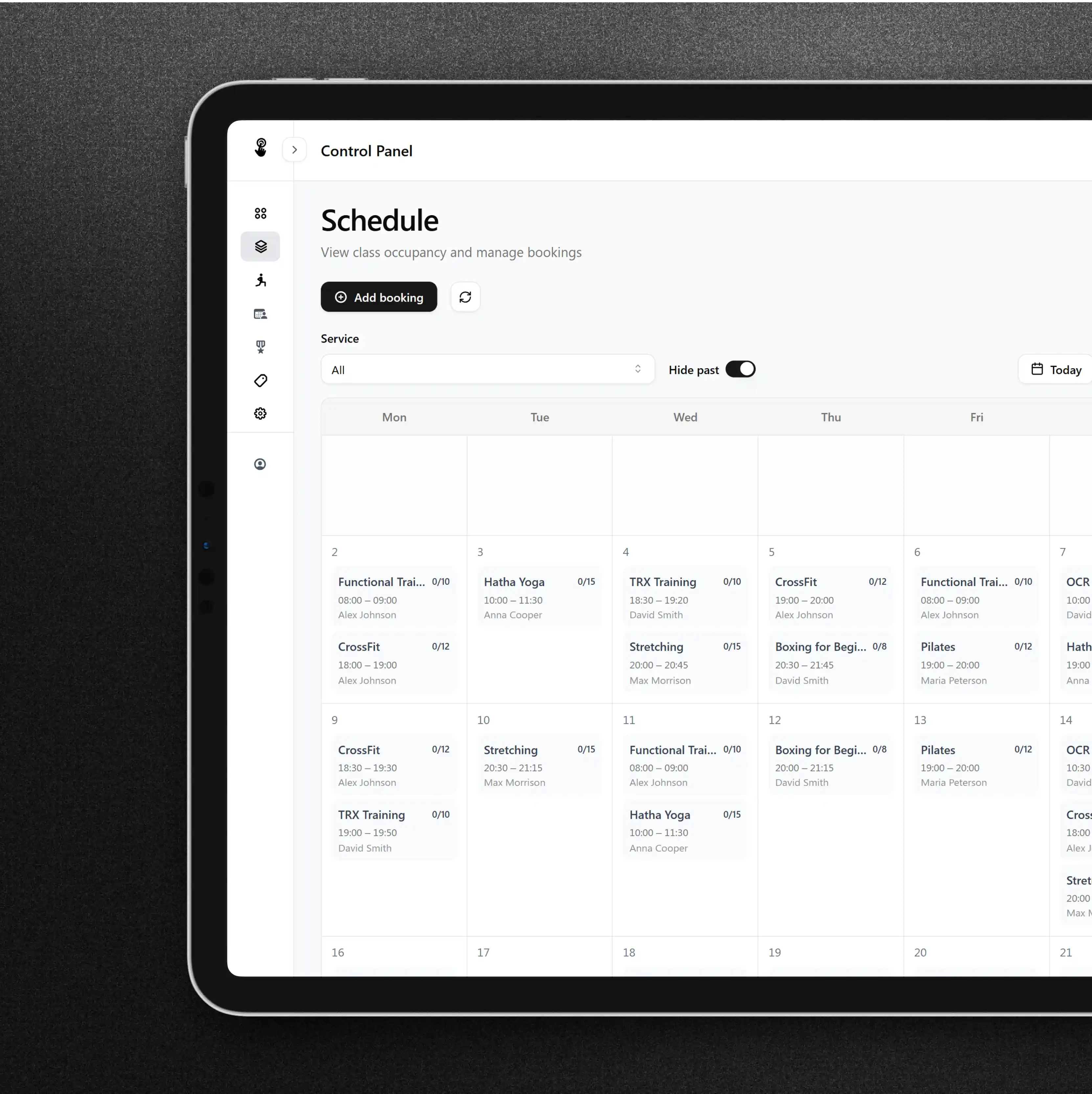 A clean, branded page with your schedule and services. Clients pick a time and book in seconds – from any device, no app needed. Share it in your Instagram bio, WhatsApp, or print as a QR code at your gym.